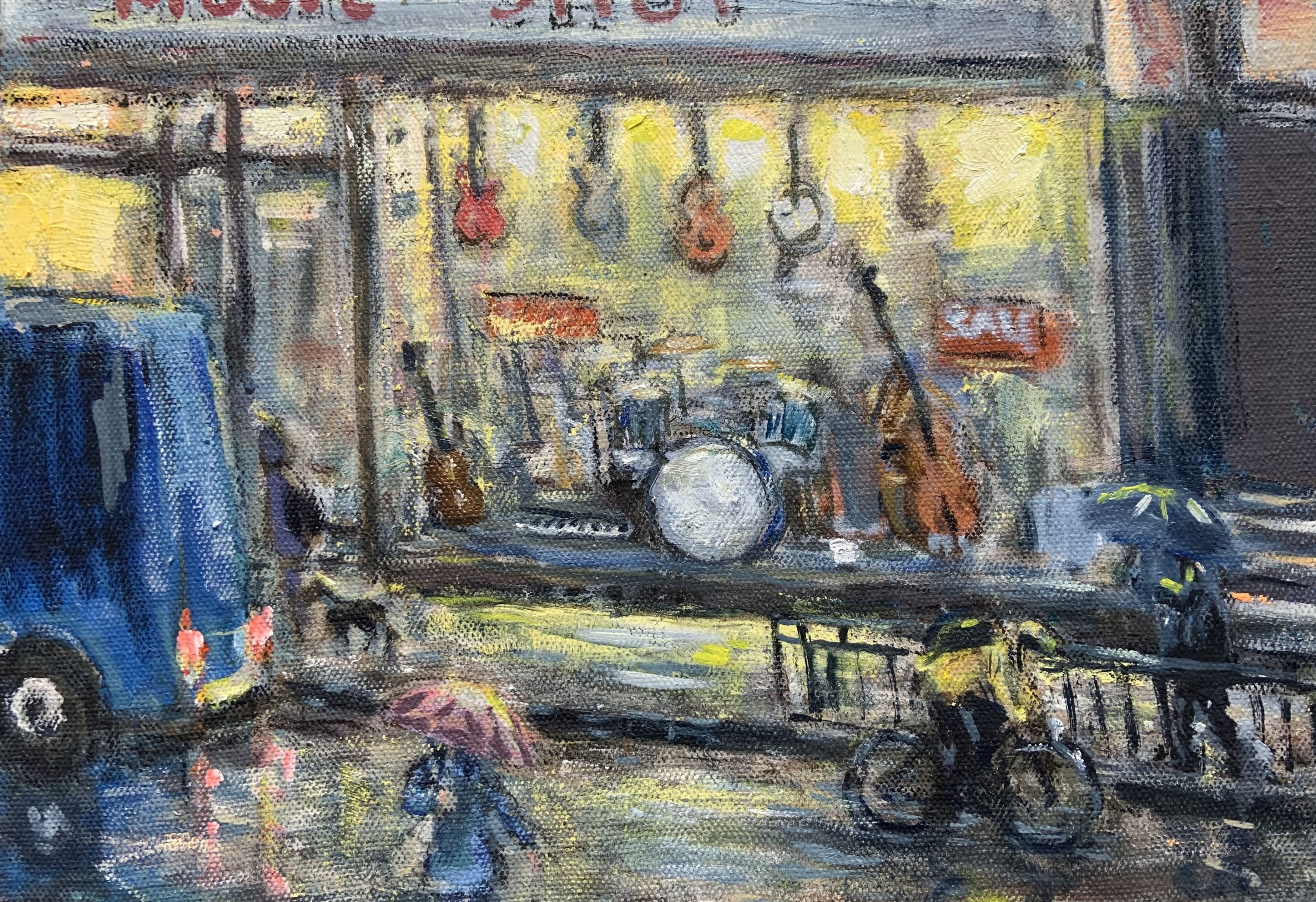 Henry Kondracki RSA, Music Shop Lights. Oil on canvas.