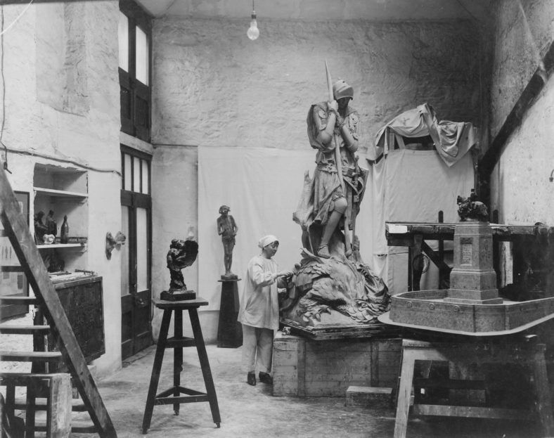In fig. 2 Williams is seen her studio in 1922. Her biographer, Phyllida Shaw, has explained that she is working on a figure of St George and the Dragon for a war memorial in Komani, South Africa, designed by the architect Sir Robert Lorimer (1864-1929).[xv] Furthermore, the sculpture on a stand at the back is Pan, which Williams showed at the RSA in 1913, whilst the work on a stand at the front left is Wind and Wave, which was shown at the RSA in 1912. In the right foreground is a one-inch scale model of Paisley War Memorial. This was unveiled in the city in 1924 and was another collaboration between Williams and Lorimer. The model was shown at the RSA in 1921, the year of Williams’s nomination at the age of forty-four, by which point she was, without doubt, of ‘high reputation’ in her profession as a sculptor.