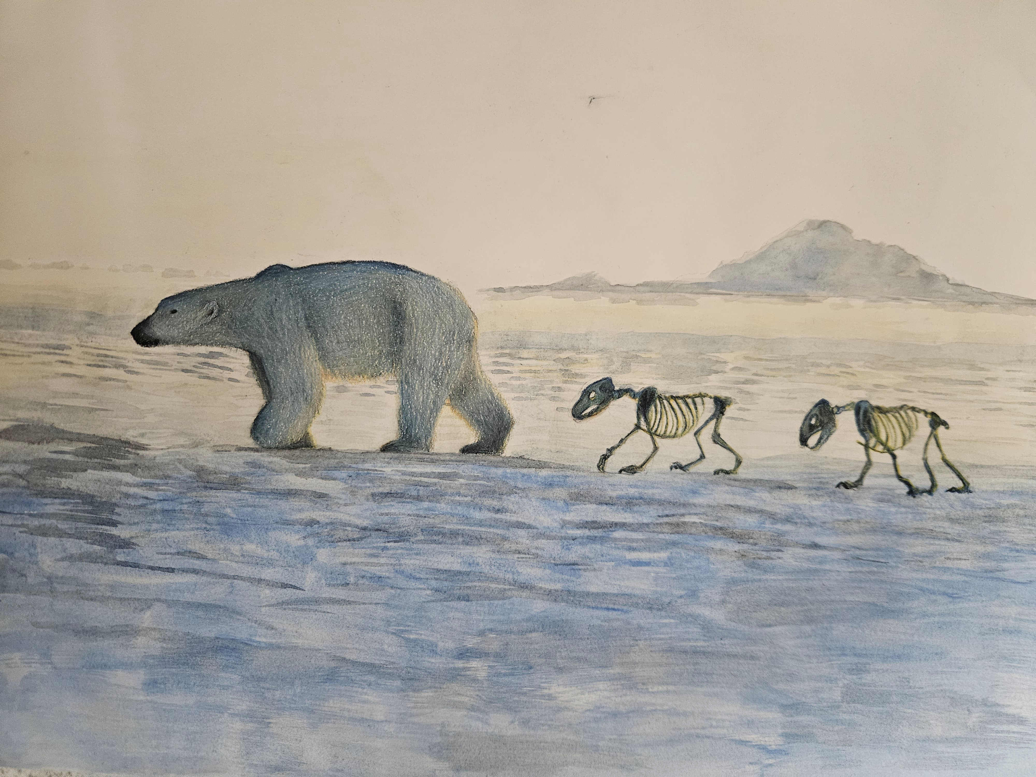 Mae Barr from Campbeltown Grammar School received 1st prize in the 2024 Chairs Challenge. The theme for the challenge was "The World Needs More of This!”, and Mae’s work looks at the impact of climate change on the world’s animals: 'The chair’s challenge made me think about raising awareness of this issue. I wanted to paint the polar bears because they are affected by climate change, we see them balancing on tiny melting icebergs. By adding the skeleton cubs, I show what a lack of awareness would mean to all living things on the planet.'