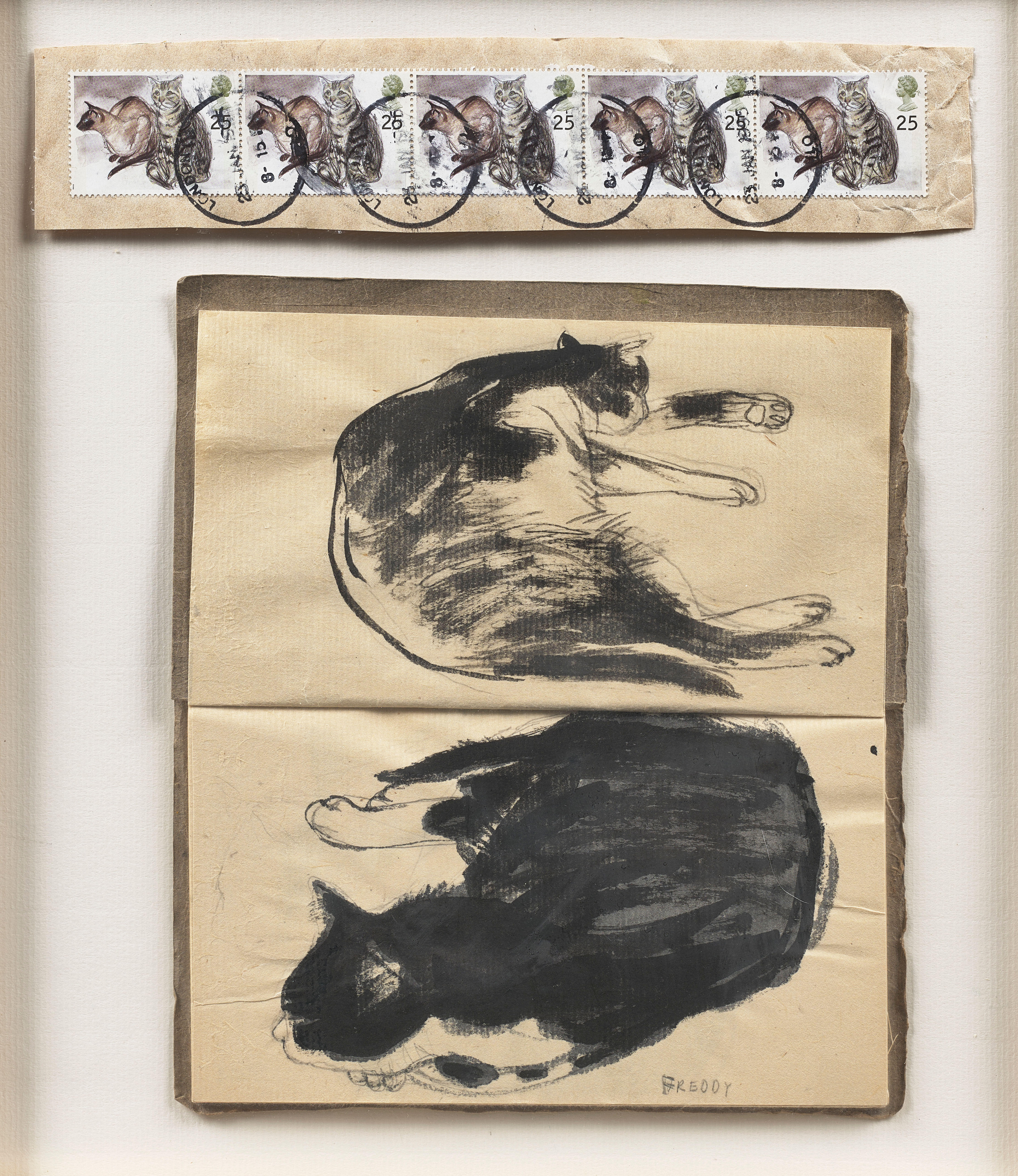 The highest value stamp featured Fred, a black and white cat who had been the subject of Elizabeth’s works for a while. Colin Greenslade, RSA Director, has fond memories of meeting Fred on his visits to Elizabeth and her husband, the artist John Houston RSA. Fred was a friendly cat and happy cosy up on any available lap.
